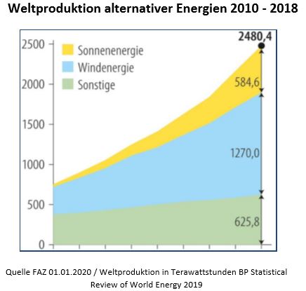 Und der Ausbau alternativer Energien geht kräftig weiter. Natürlich geht er niemals allen schnell genug, aber man sollte die gegebene positive Dynamik nicht unterschätzen. In Deutschland stammen 2019 bereits rund 46 % des dort erzeugten Stroms aus erneuerbaren Energien, in den USA sind es immerhin schon fast 20 %.