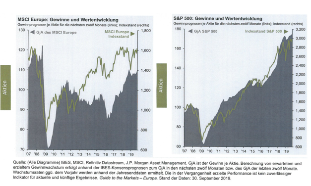 Man beachte zunächst, dass die Werte auf der vertikalen Achsen der beiden Graphiken nicht ident sind. Wären sie das, dann müsste die Graphik auf der rechten Seite, die die Entwicklung in den USA zeigt, doppelt so hoch sein wie die auf der linken. Wesentlich aber ist, dass in den USA der Zusammenhang zwischen der Entwicklung der Gewinne der Unternehmen   und der Entwicklung der Aktienkurse langfristig sehr eng ist. Auch der Absturz 2009 ging bei Gewinnen und Kursen ziemlich synchron vor sich. Dieser Zusammenhang kann gelegentlich kurzfristig durch Panik-ausbrüche an den Börsen unterbrochen werden, sei es weil wie etwa 1929 die Finanzierung von Aktienkäufen unter Inanspruchnahme viel zu hoher Risken erfolgt ist, oder aber, weil Spekulation-sblasen wie etwa 2008 im Hypothekarbereich platzen. Am langfristigen engen Zusammenhang zwischen Gewinnen einerseits und Aktienkursen andererseits hat das nichts geändert.