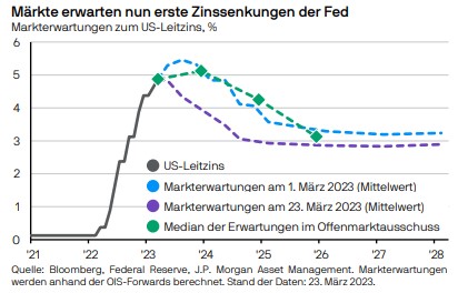 Warum ist in unserem Zusammenhang, in dem es vor allem um Perspektiven für die nächste Zeit geht, so eine theoretische Streiterei überhaupt von Interesse? Unserer Meinung nach deshalb, weil sich die Notenbanken stark an theoretischen Konzepten orientieren und sich die Anleger stark an den Entscheidungen der Notenbanken. In den letzten Monaten sanken die Kurse immer dann, wenn Vertreter der FED einen harten Kurs andeuteten, und sie sind gestiegen, wenn die Marktbeobachter Anzeichen für eine weichere Haltung zu sehen glaubten. Der Kursanstieg der letzten Märzwoche in New York hängt eng mit den Erwartungen auf ein baldiges Sinken der Leitzinsen zusammen, wie die nachstehende Graphik zeigt.