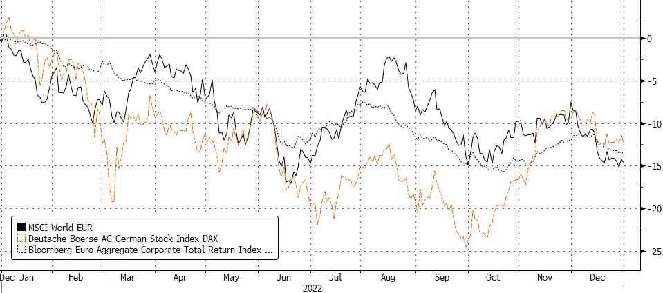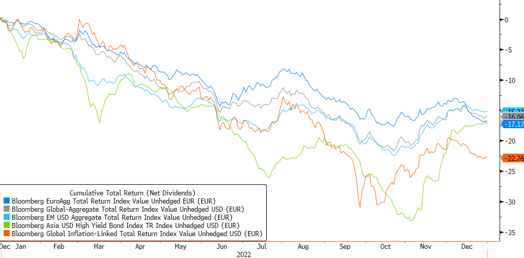Das abgelaufene Jahr war auch für Anleihen eines der schlimmsten seit Jahrzehnten. In der nachfolgenden Grafik wird die Entwicklung (in Prozent) von Anleihen-Indizes aus unterschiedlichen Regionen dargestellt.