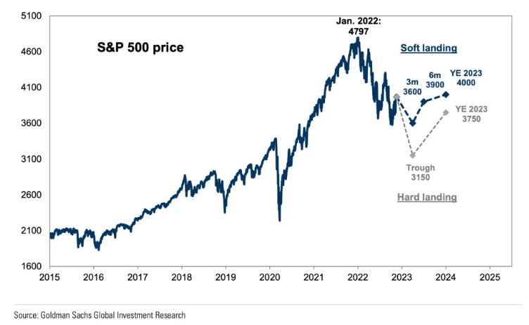 Die nachstehende Graphik von Goldman Sachs bringt die erwartete konjunkturelle Aufhellung als Antreiber einer neuen Aufwärtsbewegung recht gut zum Ausdruck, und zeigt zugleich die Bandbreite der erwarteten Entwicklung je nach der Schwere der erwarteten Rezession.