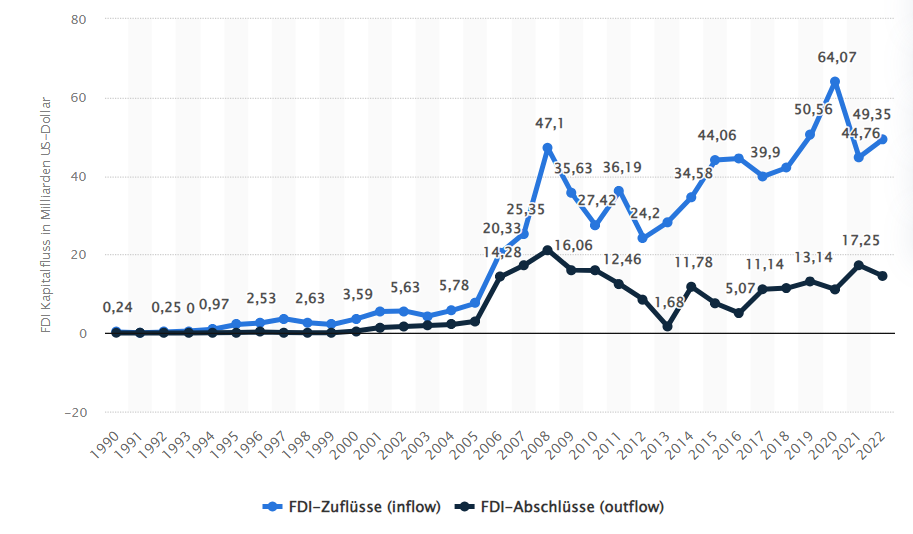 Direktinvestitionen in Indien – und ihre Rückflüsse ins Ausland (in Mrd $).
