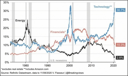 Für das Steigen der Börsenindizes trotz doppelter Krise gibt es aber noch einen dritten Grund. Der Zuwachs wurde nämlich, während viele andere Aktien verloren haben, weitgehend von nur zwei Branchen getragen, von der Pharma- und Gesundheitsindustrie einerseits und, noch stärker, von High Tech. Die nachstehende Graphik zeigt das mit aller Deutlichkeit. Die Entwicklung der High-Techs, die ja auch in New York hoch gewichtet sind, war eine ganz andere als die der meisten Aktien anderer Branchen. Der Höhenflug der High-Techs hat in den Indizes sogar die anhaltenden Kursverluste in den bedeutenden Sektoren Energie (hauptsächlich Erdöl) und Finanzen überkompensiert.