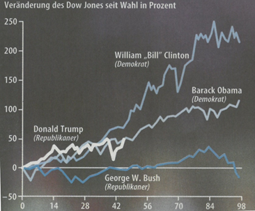 Tatsächlich haben die Börsen, bzw. im Wesentlichen die großen Konzerne auf die Wahl von Trump zum Präsidenten vor vier Jahren wesentlich freundlicher reagiert als vorher befürchtet. Schließlich ist ja vor allem seine Steuerpolitik den großen Konzernen sehr entgegen gekommen. In der Zwischenzeit hat er sich zumindest bei dieser Gruppe auch weniger Sympathien verscherzt als nach seinem Verhalten eigentlich zu erwarten wäre. Aber erstens sollte man den Einfluss eines etwaigen Endes seiner Präsidentschaft nicht überschätzen. Die obige Graphik zeigt, dass die Börsen sich auch unter anderen Präsidenten ganz gut entwickelt haben. Trump ist nicht der Heilsbringer für Wirtschaft und Börsengeschehen, als der er sich gerne ausgibt.